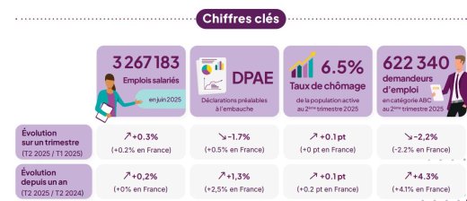 Le taux de chômage régional de la population active s'est établi à 6,5 % au 2è trimestre 2025. Il a augmenté de +0,1 point au dernier trimestre et de +0,1 point sur un an (évolution de +0 point en France sur le trimestre et +0,2 point sur un an).