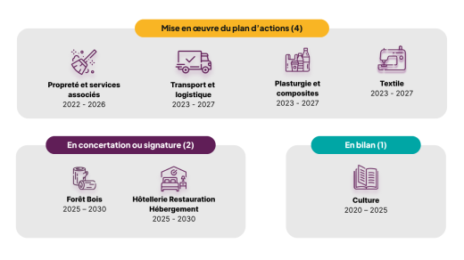 - Transport et logistique : il est engagé pour 2023-2027, visant notamment à répondre aux tensions de recrutement et à renforcer les parcours de formation.